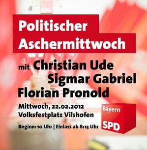 Der Münchner Oberbürgermeister und designierte Spitzenkandidat für die Landtagswahl 2013 Christian Ude, der Parteivorsitzende der Bundes-SPD, MdB Sigmar Gabriel und der bayerische Landesvorsitzende MdB Florian Pronold bilden das zugkräftige Redner-Trio beim traditionsreichen Aschermittwoch der bayerischen SPD in Vilshofen.